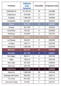 En términos absolutos, Buenos Aires encabezó el registro con 95 casos, seguida por Santa Fe con 30. No obstante, al analizar la tasa de femicidios en proporción a la población femenina de cada jurisdicción, las provincias con los índices más elevados fueron Santa Cruz, Misiones y Neuquén.